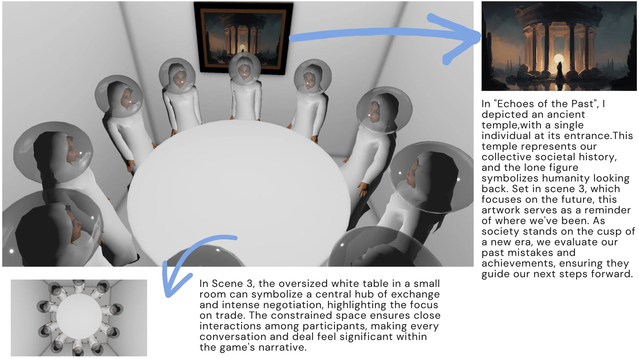 在这个场景中,玩家们发现了一个转折:他们是已经进化出了新表达方式的未来人类。之前的场景其实是回顾历史社交背景的虚拟现实体验。交易大厅是一个封闭空间,中间摆放着一个巨大的圆形桌子,未来人类就是在这里聚集的。在这里,他们交换在过去主题场景中收集到的情感体验,把这些情感看作是收藏品或者复古的娱乐项目。