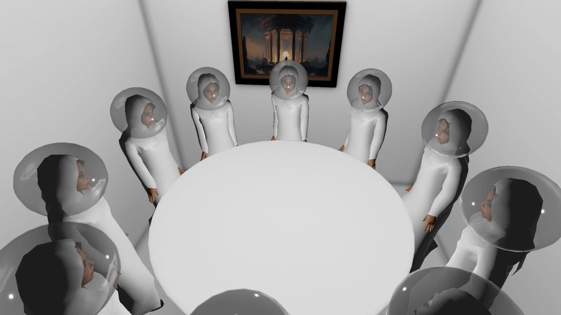 In this scenario, players uncover a surprising twist: they are future humans, evolved to express themselves differently. The earlier scenes are virtual reality experiences that hark back to historical social settings. The trading room, a confined space with a large circular table, is where these future individuals gather. Here, they exchange the emotional experiences gathered from the past-themed scenes, treating these feelings as collectibles or retro amusement.