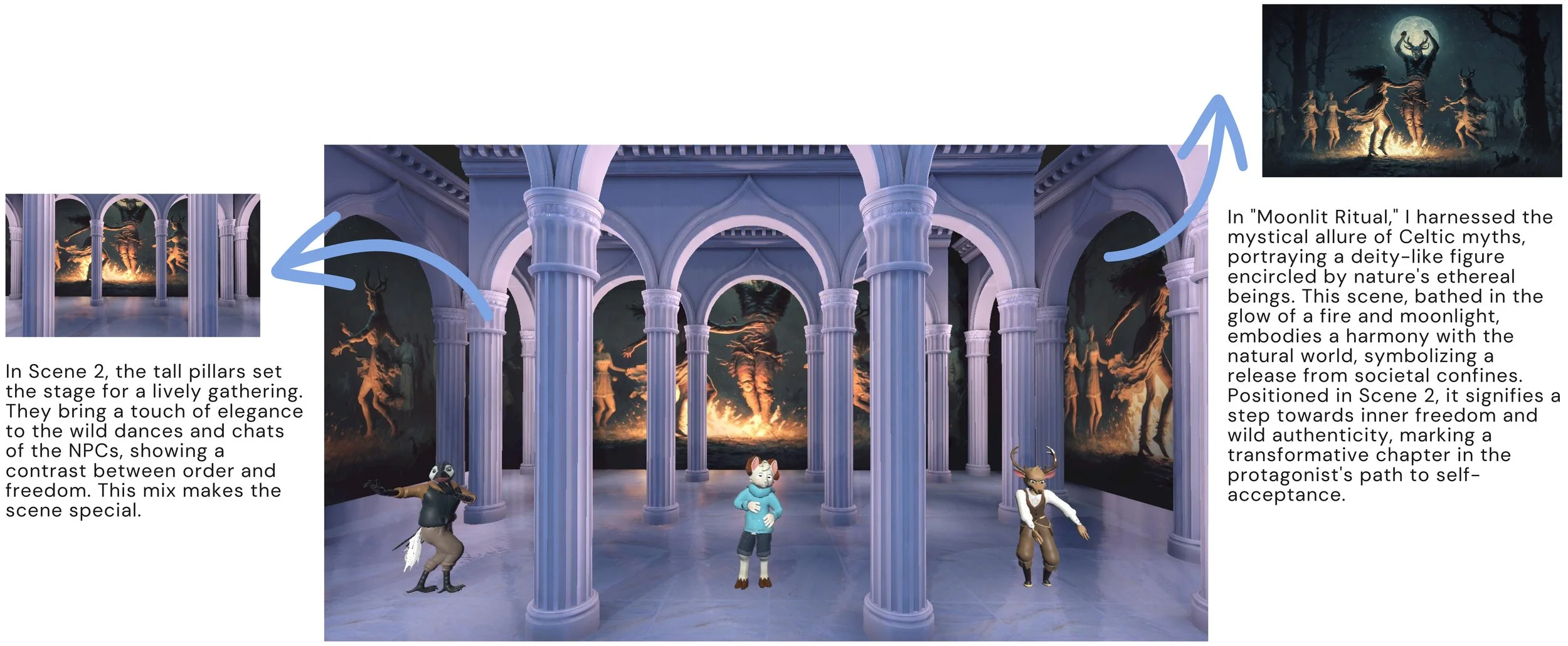 I created "Moonlit Ritual" drawing inspiration from ancient Celtic mythology. At the heart of this piece stands a figure reminiscent of the god Cernunnos, surrounded by forest spirits and dancing nymphs. As the fire blazes and the moon illuminates the scene, the painting captures a moment that signifies the balance of nature and the embrace of primal energies. This artwork, used in Scene 2 of my project, represents a personal release from societal chains. Through this painting, I wish to convey the protagonist's journey of self-discovery, embracing the wild and untamed aspects of their being. It serves as a pivotal moment of realization and acceptance in the narrative.