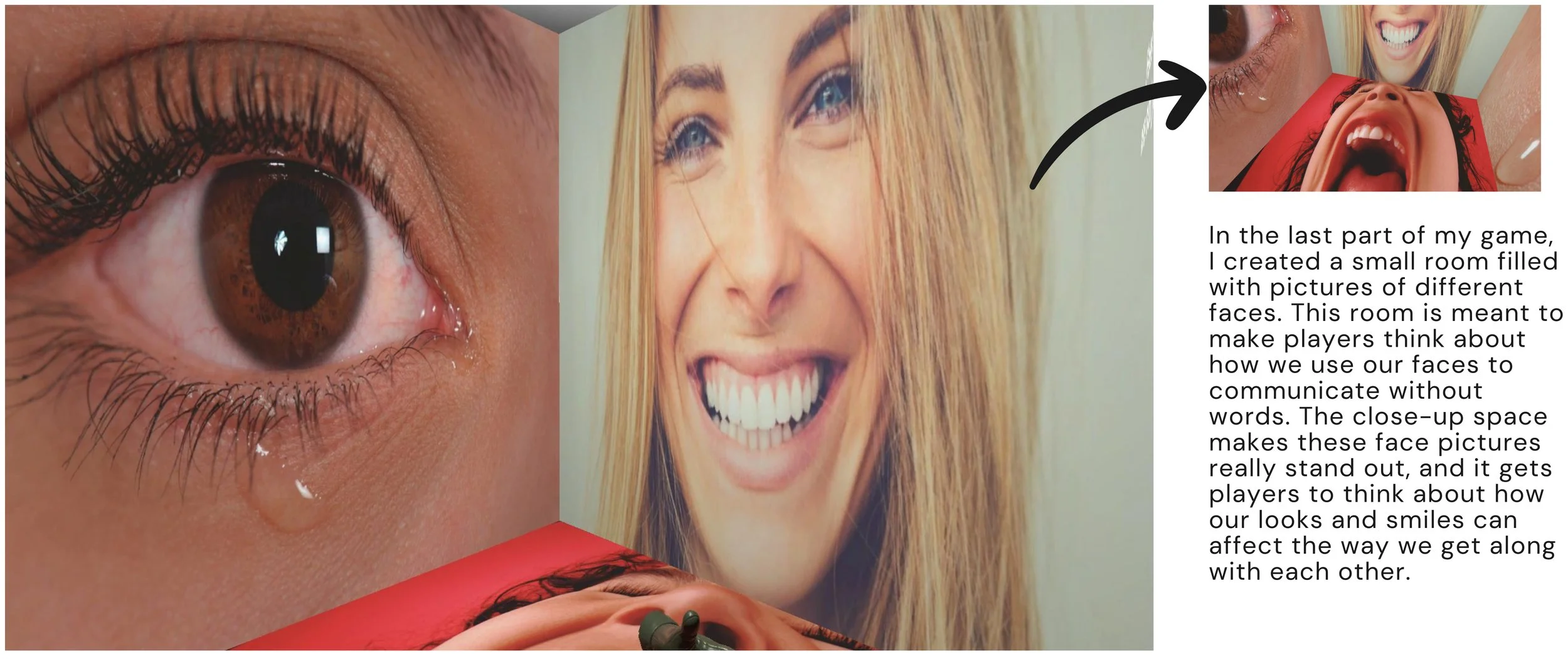 In the game's final room, close-up images of faces showing strong emotions cover the walls. The close quarters make these feelings seem even more intense. Players get an up-close look at tears in eyes and smiles on lips, pushing them to think about the complex web of emotions that connect us all as humans.